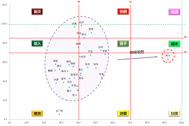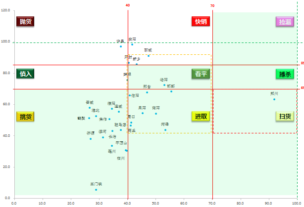 根据九宫格阶梯筛选法则,处在阶梯阴影区位重点拓展城市:处在扫货区内的重点拓展城市为郑州;黄线框内的重点投资城市,主要包括开封、新乡、聊城、蚌埠、邢台、洛阳、邯郸、信阳、阜阳、南阳、周口、商丘、菏泽;处在挑货区的重点拓展城市,主要有濮阳、焦作、漯河、运城、长治、鹤壁、三门峡;聊城处在快销区、应注意控制风险,快销为主。