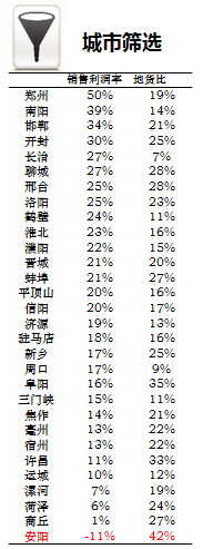 以行业领先房企投资评审标准作为筛选器,安阳销售利润率为负,除战略考量外,能不进驻则不进驻;焦作、亳州、宿州、许昌、运城、漯河、菏泽、商丘城市平均销售利润率低于15%,应关注市场风险,重点把控好获取土地位置及价格。