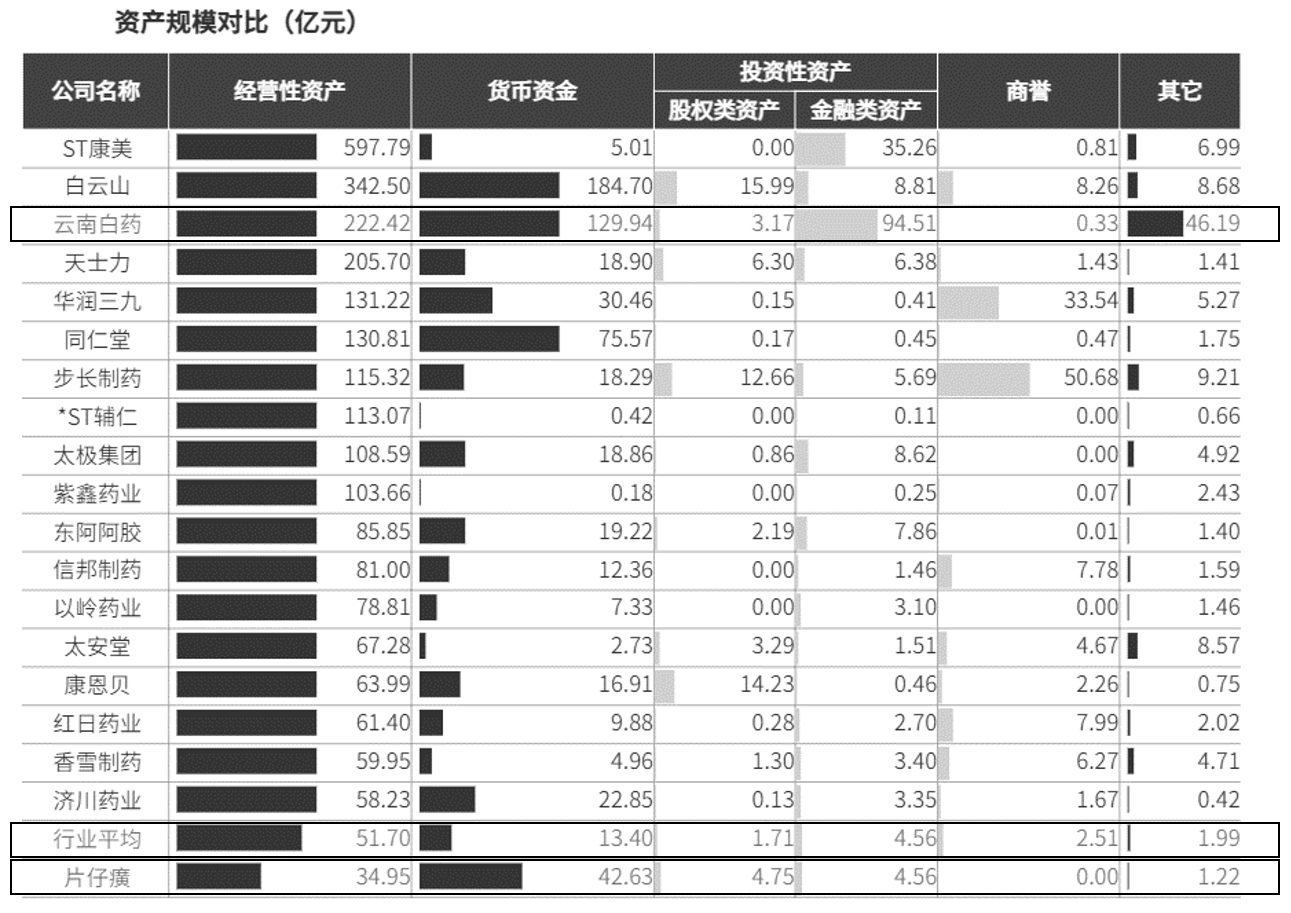 云南白药是创制于1902年的百年中华老字号品牌,中国驰名商标,公司目前涉足药品、健康品、中药资源及医药物流等领域,产品畅销国内、东南亚,并逐渐进入欧美日等发达国家。根据申万行业分类标准,云南白药属于医药生物下的中药行业,为全面了解云南白药的资产结构,我们将云南白药的资产结构和中药行业均值,以及中药行业另外一家上市公司片仔癀进行对比。图8-22分别展示了云南白药、片仔癀、中药行业的资产结构情况,表8-6展示了行业经营性资产规模前20名企业的五类资产规模情况。