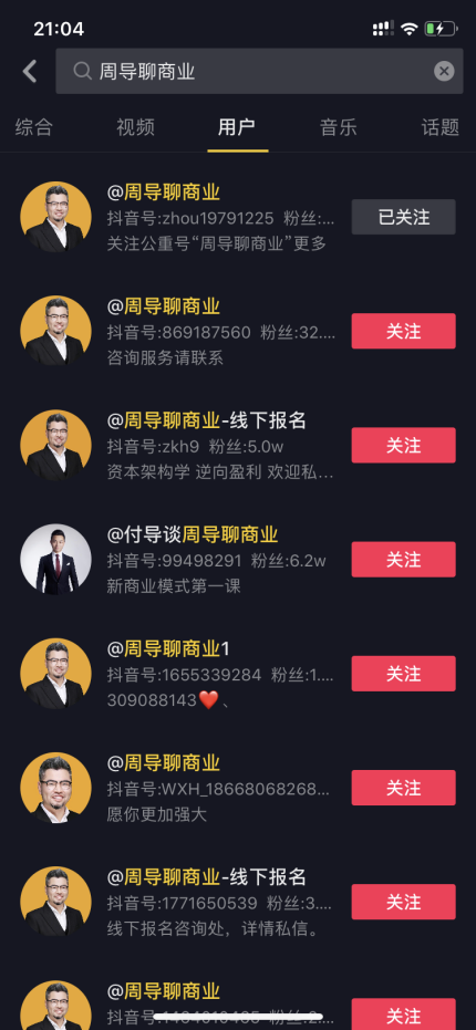 很多教育类账号在抖音平台发展很快,有一个账号叫“周导聊商业”(图7-7)。周导在2018年之前做了六七年的培训,之前效果不好,主业是帮企业做企划案,收费是一年120万元。后来通过抖音,他快速吸引到300多万粉丝,现在每个月开1~2场培训,每场每人费用9800元,每场人数1000~2000人。所以现在每场培训收入有1000万~2000万元。这只是三天两夜课程,然后会有30%的学员继续上高阶课程,按每人10万元的费用,可以想象变现能力多么强大。