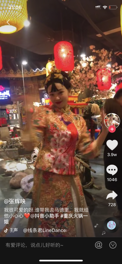 实体店利用抖音做引流的案例越来越多。重庆的汇山城火锅店依靠火锅姐小辉辉(图7-12)的舞蹈爆火。一个火锅店的普通员工,因为会跳舞,比较活泼,吸引了大量粉丝去店内看她。小辉辉也已经从一个普通服务员,晋升为联合股东。