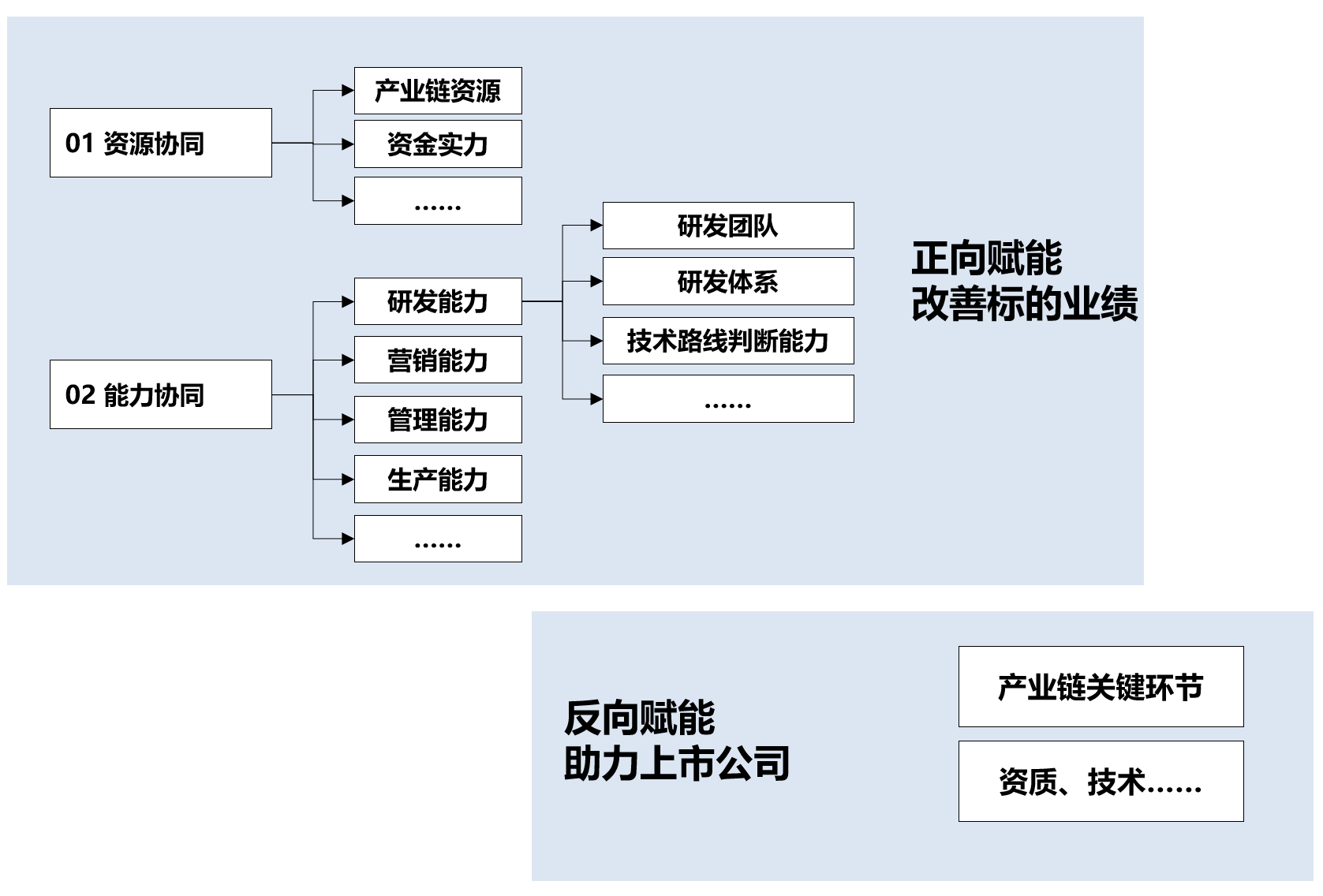 然后,我们再去判断战略是否具有协同性。一般来说,并购协同性可分为正向赋能和反向赋能。其中,正向赋能是指上市公司通过资源协同和能力协同改善被并购企业的业绩。资源协同,例如有产业链资源、资金等,能力协同,例如有研发能力、营销能力、管理能力、生产能力等,而反向赋能则指被并购企业处在产业链的关节环节或其拥有较强的资质和技术等,能够助力上市公司快速发展。如图9-2所示。