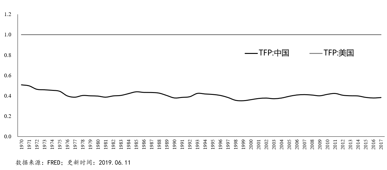 中国经济正从高速增长转为高质量增长阶段,但中国经济产出效率仍低于美国、德国、日本等发达国家。2019年中国全要素生产率(PPP计价)为美国的38.4%;2017年中国劳动生产率为1.3万美元,约为美国11万美元的12%。如图4-25至图4-27所示。