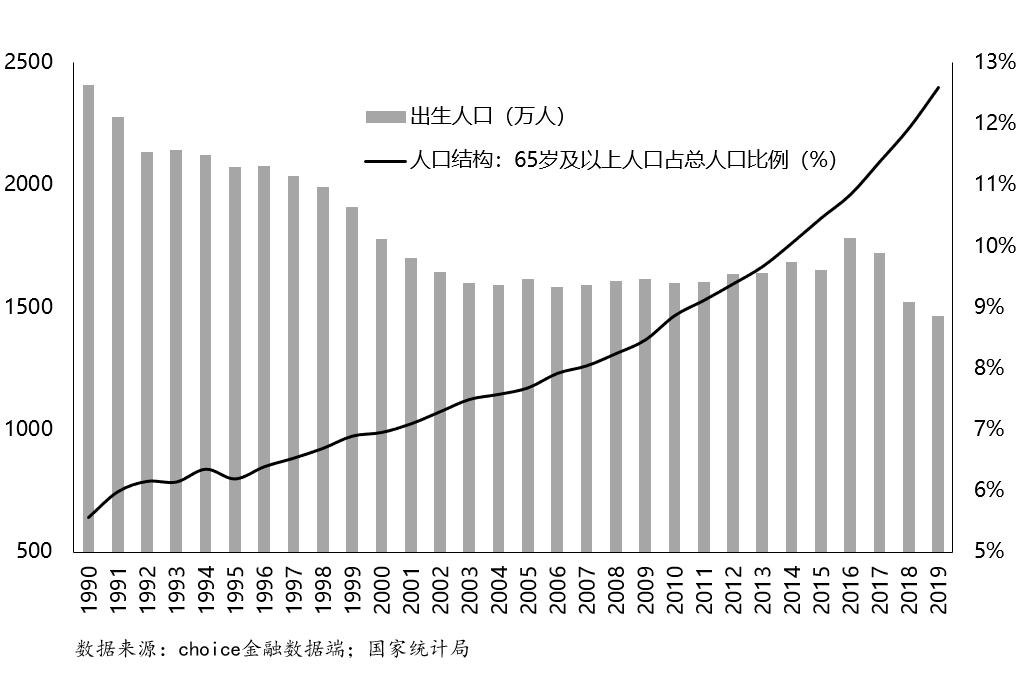 当前中国出生人口仍处于快速下滑期,预计2030年将进一步降至不到1100万。中国2016-2019年一孩出生人口从981万降至593万。2019年中国出生人口降至1465万,继2018年中国出生人口下降200万后,2019年出生人口再下降58万。而老龄人口占全国总人口的比重持续提升。如图4-29所示。
