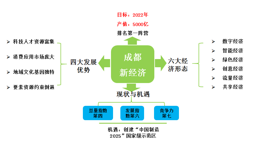 成都是新一轮新经济快速腾飞的领军者,成都正在全力推进新经济建设步伐,提出要发挥四大发展优势,发展数字经济、智能经济、绿色经济、创意经济、流量经济、共享经济六大经济形态,展望到2022年,成都将基本形成具有全球竞争力和区域带动力的新经济产业体系,建成最适宜新经济发育成长的新型城市。同时,新经济产值达5000亿元以上,新经济总量指数排名进入全国第一方阵。