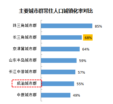 目前,成渝城市群常住人口城镇化率为55%,低于我国常住人口城镇化率57.4%。根据规划,成渝城市群到2020年城镇化率将达到60%,预计有480万人实现城镇化。如能达到京津冀城市群64%城镇化率水平,预计有870万人实现城镇化。