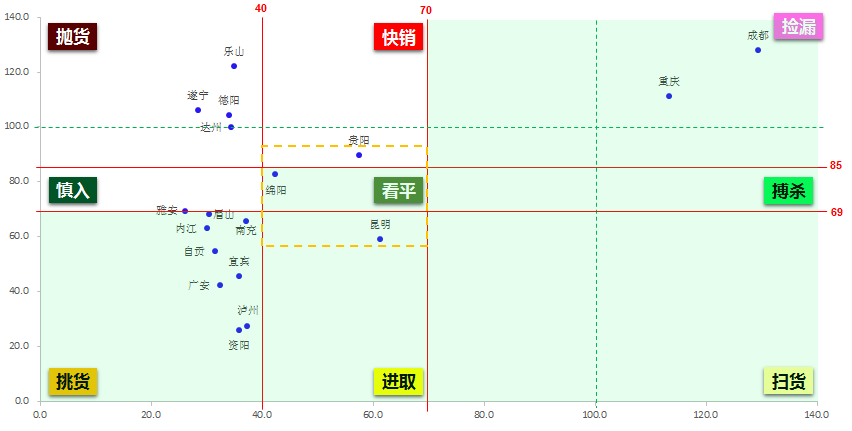 根据九宫格阶梯筛选法则,处在阶梯阴影区为重点拓展城市:黄线框内的重点拓展城市,主要包括昆明、绵阳、贵阳,贵阳属于黔中城市群的核心城市,昆明属于滇中城市群的核心城市,明显可以看出贵阳偏热,昆明偏冷,目前应是进驻昆明的最佳时机。绵阳市场较为封闭,成都对其的吸附力不太高,可择优质地块进入;挑货区的重点拓展城市,主要有资阳、广安、宜宾、泸州、自贡、内江、眉山、雅安等8个城市,如不属于成都、重庆的外溢区域,或气候互补区域,除非优质项目,暂不宜进入。