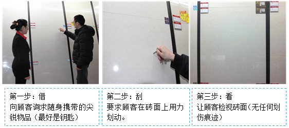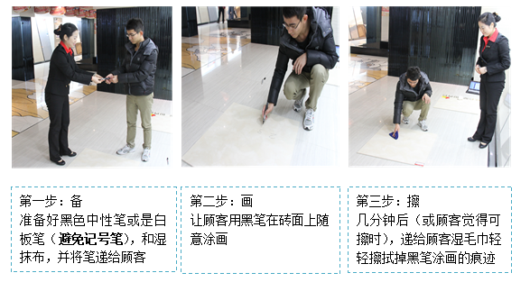 (4)用道具引导顾客体验产品。比如,如果是玻化瓷砖,导购员可以让顾客用钥匙等硬物在瓷砖表面划动,然后让其观察瓷砖表面是否有损伤;如果是水晶瓷,让顾客用油性笔或是水性笔做防污损实验,了解这款瓷砖是否容易清洗;如果顾客比较关注瓷砖的防滑性,导购员可以将水倒在瓷砖表面,让顾客在上面来回走动进行体验。