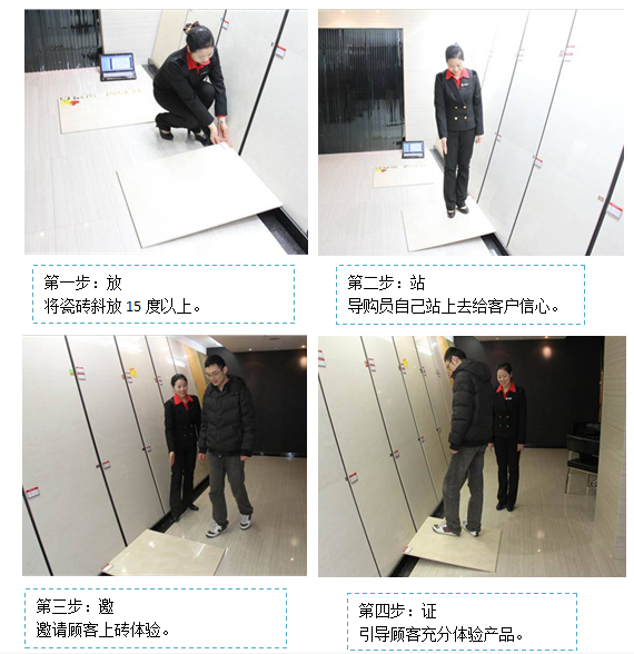感觉对比:拿一个块杂牌的砖和我们自己的砖放在地上,让顾客在上面走让顾客自己感知