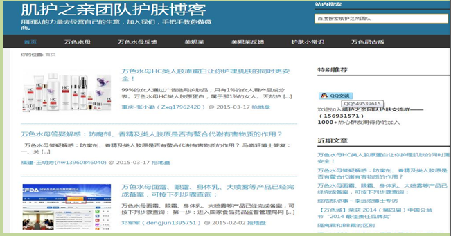 (1)客户可能问到的产品问题。可以在博客里做一些产品展示,比如护肤知识,每个产品的功效、使用方法、产品安全问题等。