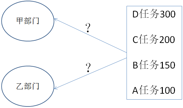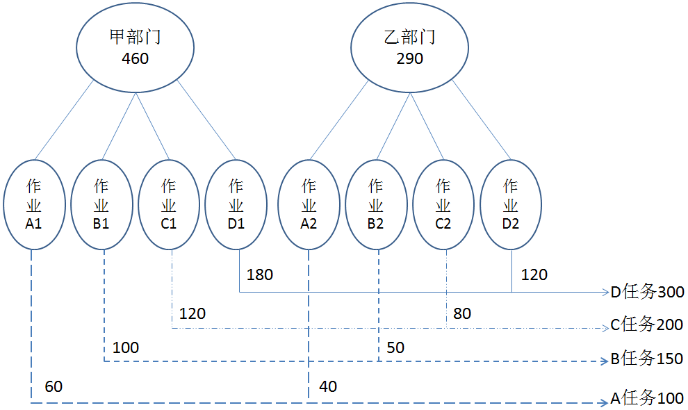 甲部门提供A1、B1、C1、D1四项作业,分别与乙部门提供的A2、B2、C2、D2等四项作业一起,完成了A、B、C、D四项任务,四项任务分别提供了100元、150元、200元、300元的收入。