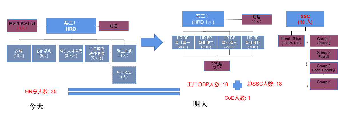 这个工厂以前是传统的人力资源组织架构,共35人 ,新的组织建成以后,BP16人留在的工厂向HRD汇报,其余19人分到了SSC18人和CoE1人,SSC人员和CoE人员不再向这位HRD汇报。