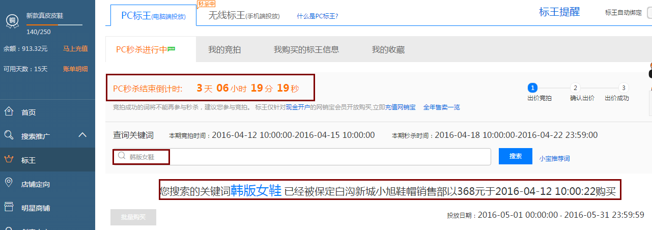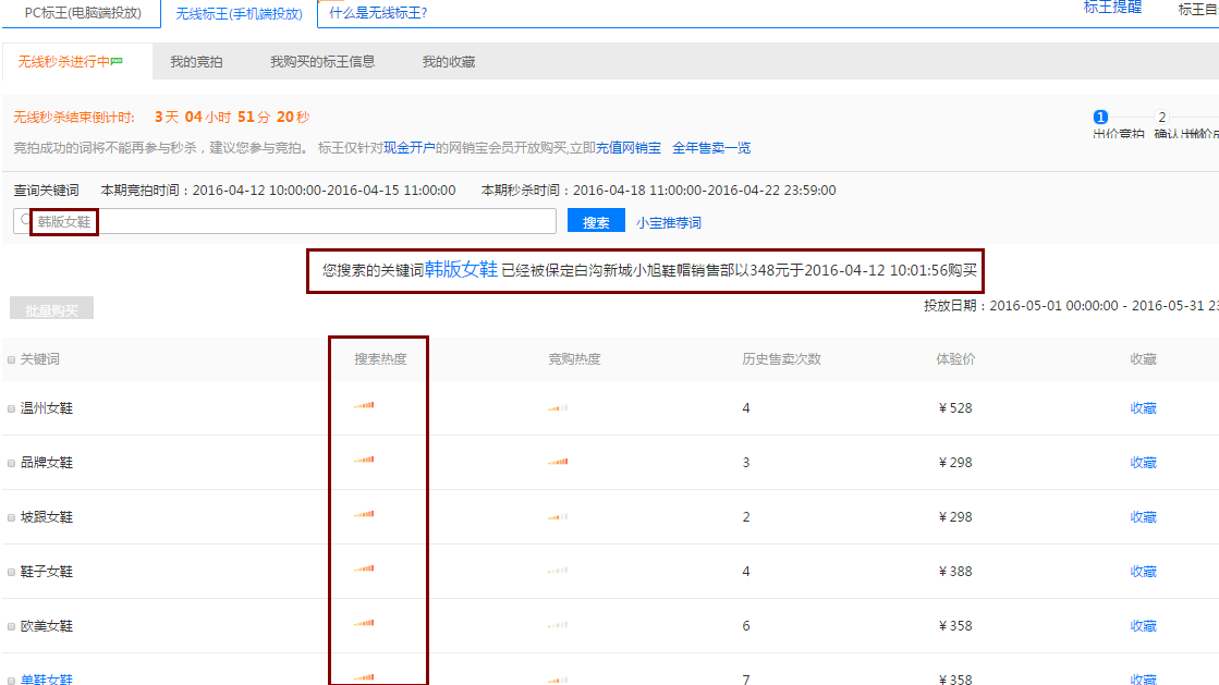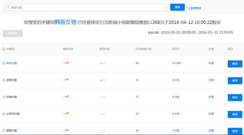 在页面中我们可以看到一个搜索对话框,在搜索对话框中输入自己的关键词,然后旁边就会有提示。比如,输入“韩版女鞋”,旁边就会出现橙色的字给你提示,告诉你还有多长时间该词会结束。另外,也会告诉你这个词什么时间被什么公司以什么价格购买了,且买了之后的投放时间是下个月。