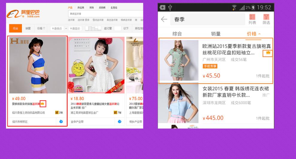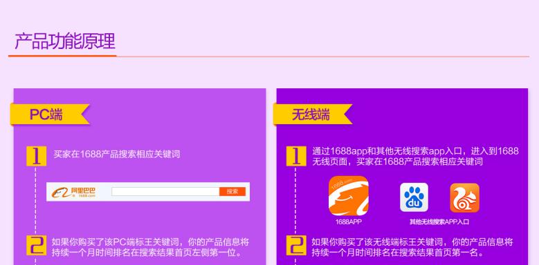 阿里巴巴无线标王(无线端):当买家在无线端页面搜索相应关键词,你的推广信息将带有“标王”标志,且在搜索结果首页第一位展示一个月。充分展示企业实力、显示企业品牌传播。