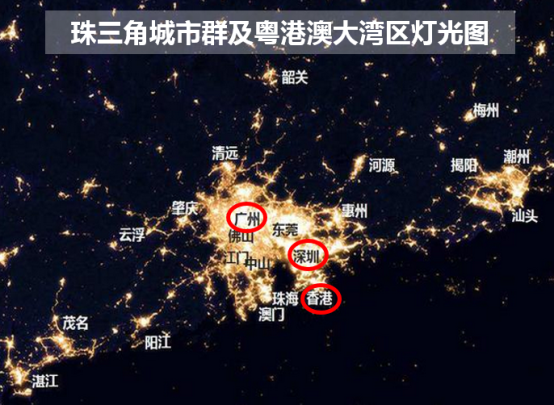从卫星灯光图可以看出,珠三角城市群区域一体化进程发展较快。现已逐步形成以广州、深圳为核心城市,以东莞为副中心,以佛山、江门、中山、珠海、惠州、肇庆、清远等为次级副中心的多中心结构的城市群。从整个大湾区来看,广州、深圳、香港灯光亮度最高,是整个湾区的核心。