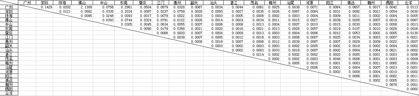 珠三角内部城市经济联系强度表