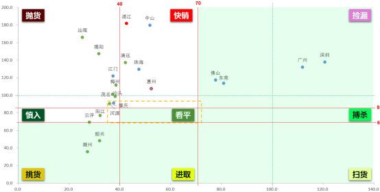 根据九宫格阶梯筛选法则,处在阶梯阴影区为重点拓展城市; 黄线框内的重点拓展城市,主要包括珠三角的肇庆和广东其他区域的河源;重点关注肇庆,肇庆人口410万,GDP超过2000亿,整体供需平衡且涨幅不大,紧邻珠三角核心区的规划新区,具有较大发展空间;挑货区重点拓展城市有云浮、潮州、韶关;湛江、惠州处在快销区,应注意防控风险。