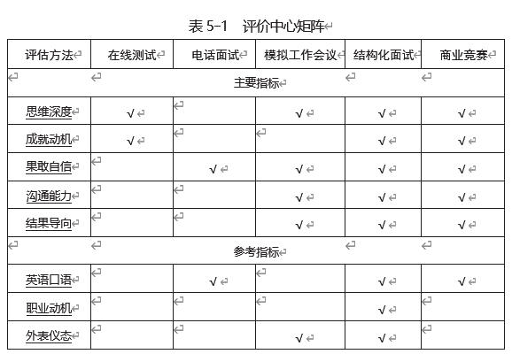 评价中心矩阵是用于设计评价中心的核心工具,又称为AC Matrix。评价中心通常是测评方法导向而不是测评维度导向,通过评价中心矩阵,可以将方法和维度统合,见表 5-1。