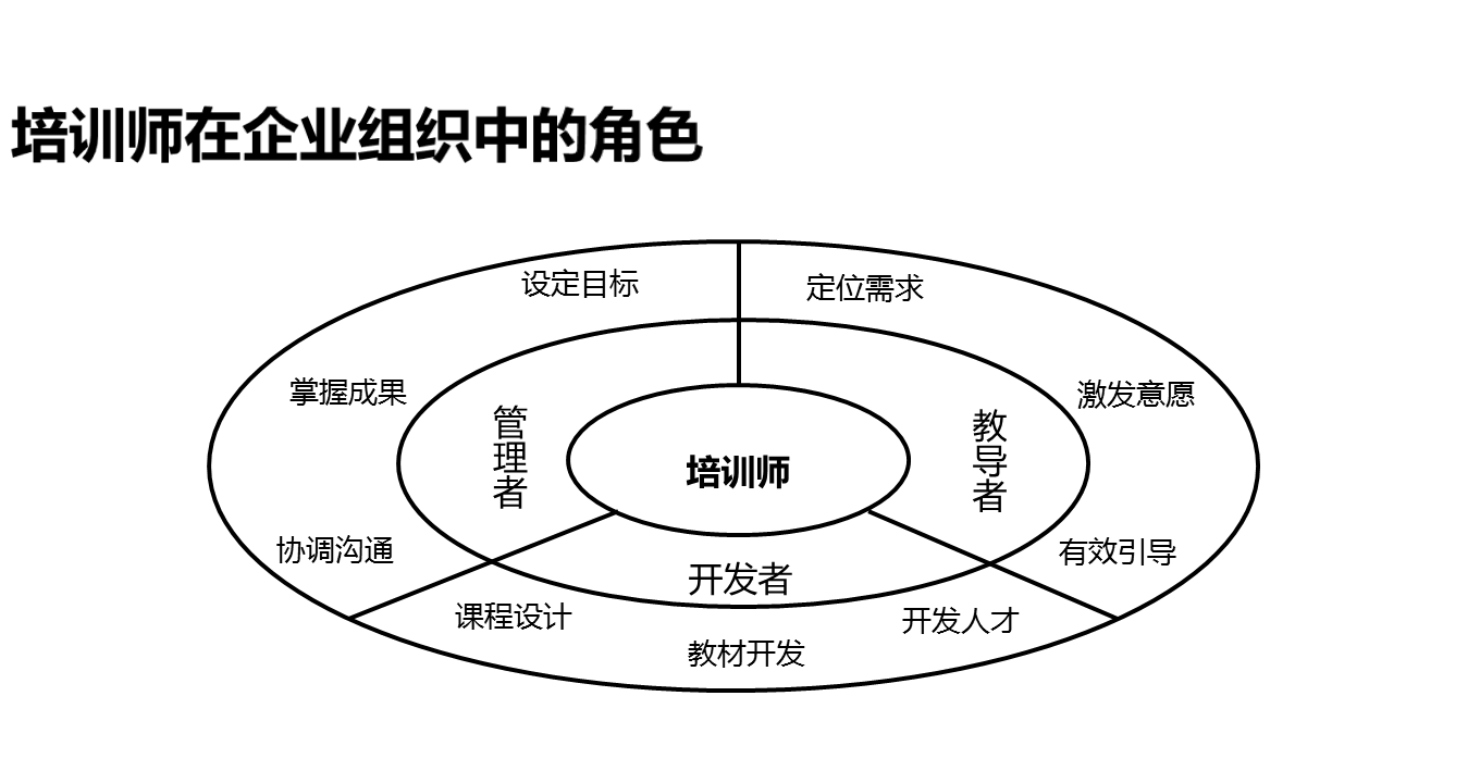 一是作为管理者的角色。培训师根据企业经营发展的阶段性目标,制定与之相适应的人才培养计划,并且通过有效的沟通与资源整合,推动员工职业能力与职业素养的提升与改善,最终实现企业组织人才队伍的持续成长。