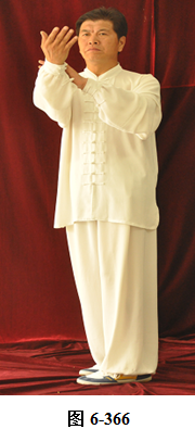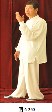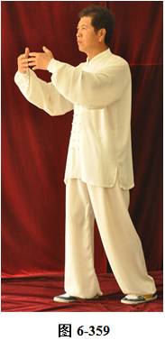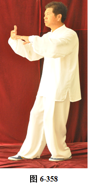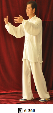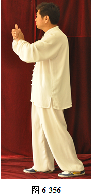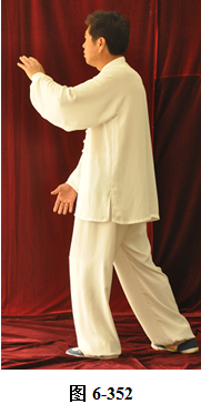 挤:接上式,腰向左微转,左掌随之向左侧挒。腰微回转上提, 身体随转面对西北。右臂随身体回转外旋抬至胸前,手心向内。左掌搭在右小臂的腕部,重心移至右腿弓膝;腰微拱向前打挤,眼神注视前方(见图6-355至6-356)。