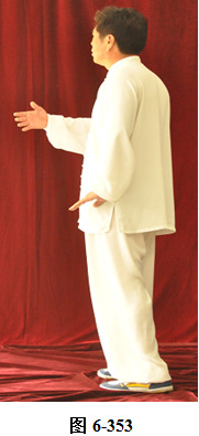 捋:接上式,腰继续上提,右臂随之上掤,左臂跟随右臂翻转左手掌, 呈两掌心斜相对。腰微拱,两手随之向右胯下捋,身体重心渐渐移至左腿。左腿屈膝微后倚,右腿稍直。上身向右侧稍含胸,右手前臂内旋使手心朝下,手指朝前;两手随腰后拱之势屈肘,缓缓向右胯下方弧形抽回捋之。左手止于右小腹前,右手捋至右臂向右下稍伸直为止(见图6-354)。