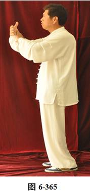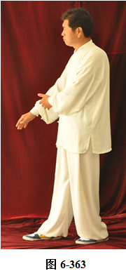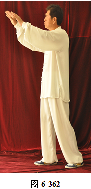 按:接上式,腰微拱,右腰向右外微转,右手臂随腰拉开,呈两手掌指尖相对;左腰下沉,随之上提,左手掌外翻与右手掌指尖平相对,两掌心均向内。左腰微含,随之向左外转,左手随之拉开,中间相离一横掌的距离;腰向后微拱,两手顺势翻转向下成按式至腹前,重心后移至左腿上,身体微含后倚,两手好似扶在箱盖上。随之含腹提腰,催促两手向前上推出,重心缓缓向前移至右腿,呈右弓步。眼神向上平视(见图6-357至6-362)。