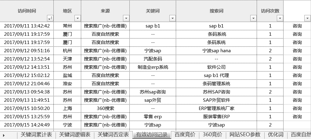 注解:凡是有咨询的,或者看了很长时间,或者是看了很多页面的访问,都称为有效访问。有效访问记录比关键词累计表记录的内容更详细,是周报表中最有价值的报表,因为它能让我们准确知道客户是搜索什么词进来的,这也算是企业做网络营销的商业机密。日后,在某个时期网络营销效果不好时,也可以把此表调出来,用之前的搜索词来检查现在的关键词排名情况。在前面我们也提到,利用此表结合其他工具,还可以有效地甄别出恶意点击。另外,对此表的分析和整理,可以及时发现网络市场的需求,为企业的市场决策提供帮助。