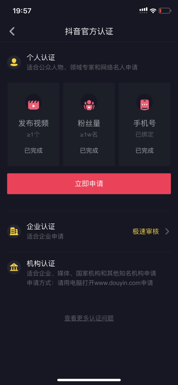 抖音和其他媒体一样,为了帮助账号增加权威性,提供了三个认证通道:企业认证、个人认证、机构认证。在抖音的“设置-账号”与“安全-申请官方认证”可以看到。