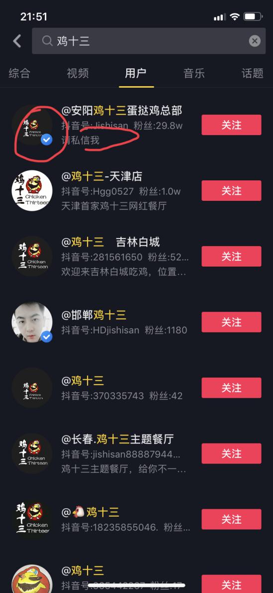 开通蓝V之后,会得到官方蓝标认证,头像右下角会有一个明显的蓝色对号,会让粉丝感觉这个是官方账号,更加信赖。比如搜索“鸡十三”,会出现很多类似的同名账号,但是第一个认证的账号置顶排在最前面(图4-19),粉丝会更加信任这个账号。