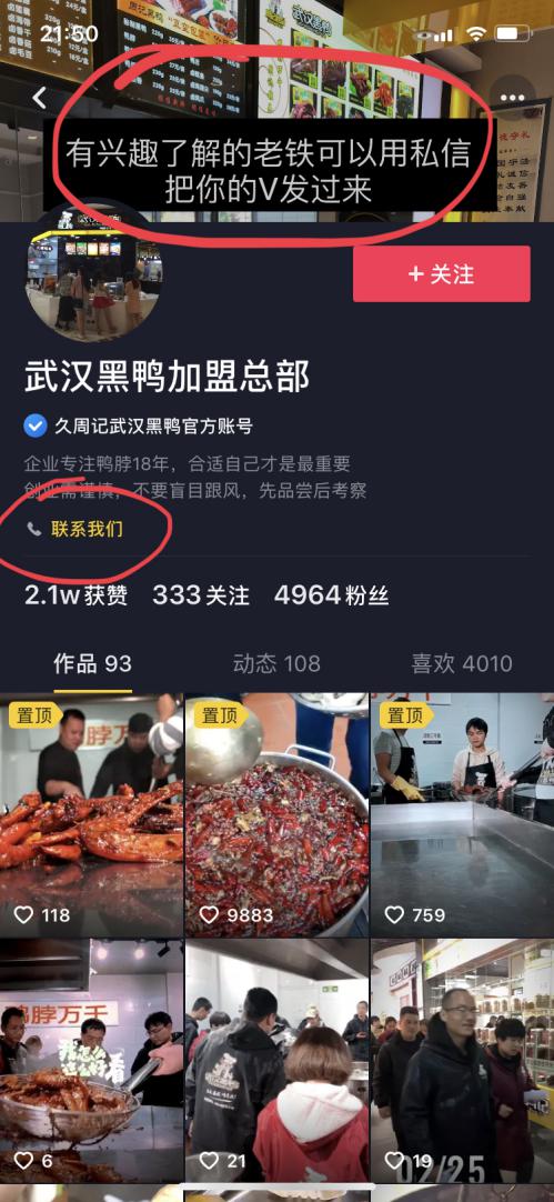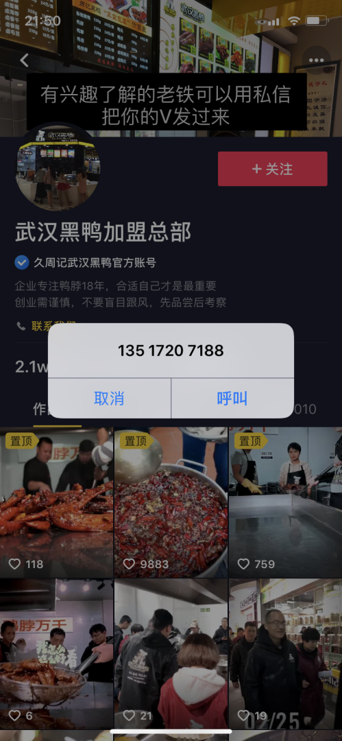 官方电话点击之后,就直接跳转出电话号码。如图4-21所示,点击武汉黑鸭账号的“联系我们”,就直接出现公司联系电话,意向客户可以选择直接呼叫。这样非常便于企业营销转化。