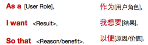 用户故事包含三部分,即3C,card-向特定用户提供的成果的简要说明,Conversation-通过对话进一步澄清细节,Confirmation-该用户故事的完成标准。格式遵循: