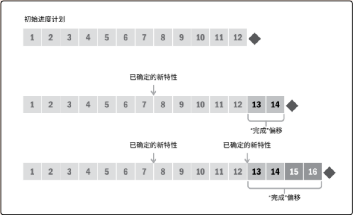 例如,PMBOK(第七版)中相应章节举的例子,图5-6显示了一个开发新智能手表的场景。初始进度计划显示,开发具有一组初始功能和特性的手表需要12个月。随着竞争对手类似产品的上市,在这组初始功能和特性的基础上不断扩增,以便紧跟市场变化,这将上市日期推迟至第14个月。第13个月,另一个竞争对手上市了一款功能更多的产品。增加这些功能会将上市日期延迟到第16个月。项目团队将在某个时点决定是否发布产品(即使它没有最新特性),或者在上市之前继续对这些特性作出更新。