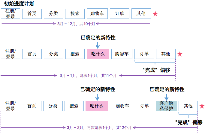 但在迭代开发渐进明细的时候,发现一个必需的新特性。例如“吃什么”,经过团队与产品经理大鹏的调研和讨论,觉得“吃什么”是必须特性。那待办清单中的优先级需要重新排序,所以“吃什么”就排到“购物车”前面,“订单”和“其他”就需要漂移。相对初始进度计划来说需要延长1个月,从2022年3月开始至2023年1月结束,这样完成目标进行了第一次的移动。