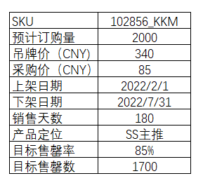 同时102856_KKM这个型号, 企业内部有数据并判断残值可以卖到40元,在考虑吊牌价不作任何折扣减价的情况下,计算出临界比率是0.85,因此目标售罄率设立在85%。