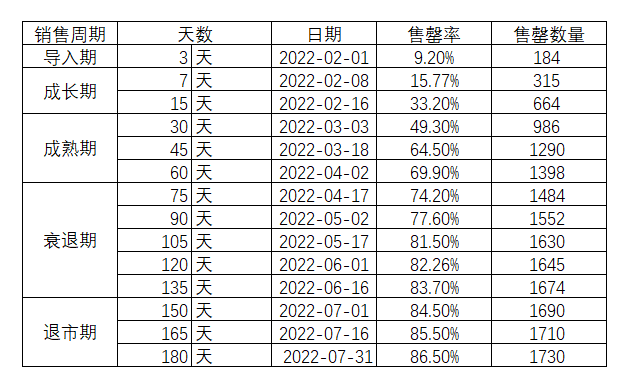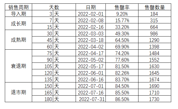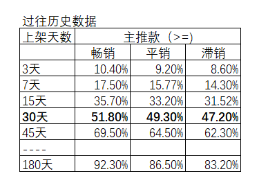 柏瑞丽公司对于相关产品,按照以下上架后的天数来划分不同的周期,一般以15天为一个阶段。除此之外,还特别设立一个退市期,让处理剩下的库存。接着回顾过往主推款的销售历史数据,按照目标85%的售罄率,并参照其中的平销款为计划准则。其中第30天就是进入销售成熟期。