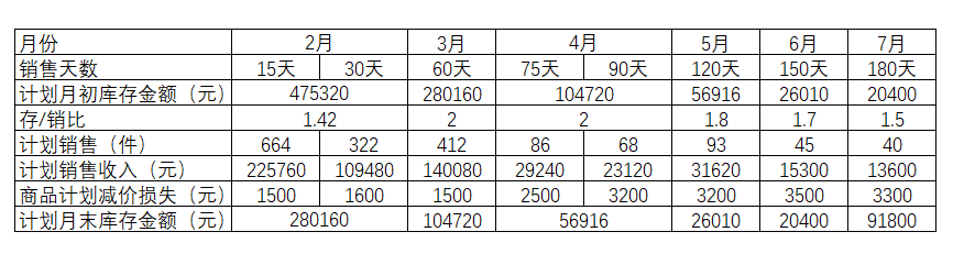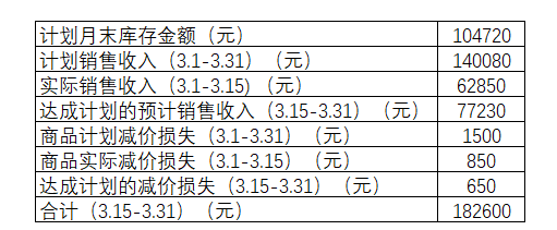 为了要达成计划的140080元的销售收入,下半个月还要增加收入77230元才能达标。不过3月上旬已经进行一定程度的减价打折促销,和吊牌价相比,带来的减价损失为850元,而本月计划的减价损失为1500元,那么离此计划还有650元的差异。这么一来,月末计划的库存加上达成计划的销售收入差异以及减价损失差异,合计为182600元。