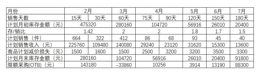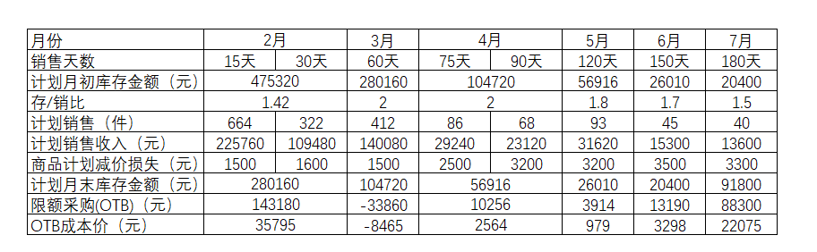 不过由于预计采购量是2000件,这个数量也是柏瑞丽公司和供应商合同的规定最小采购量。那意味着在180天按照计划,预期销售1730 件,因为目标售罄率只是85% 。因此实际上最后一个月月末库存应该还有2000-1730 = 270件 。把该数据补充进去,7月月末库存金额和OTB都会变得比预期的数据要大。