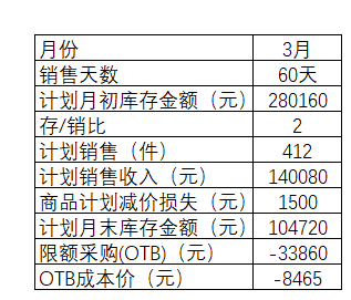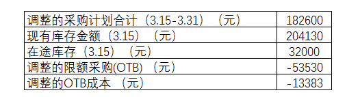由于在3月15日的库存和销售,与3月份计划的库存,销售收入相比,存在差异,因此OTB和OTB成本也随着而一定变化了。在检查情况后,发现不如预期,那么限额采购也应该留下更多空间。