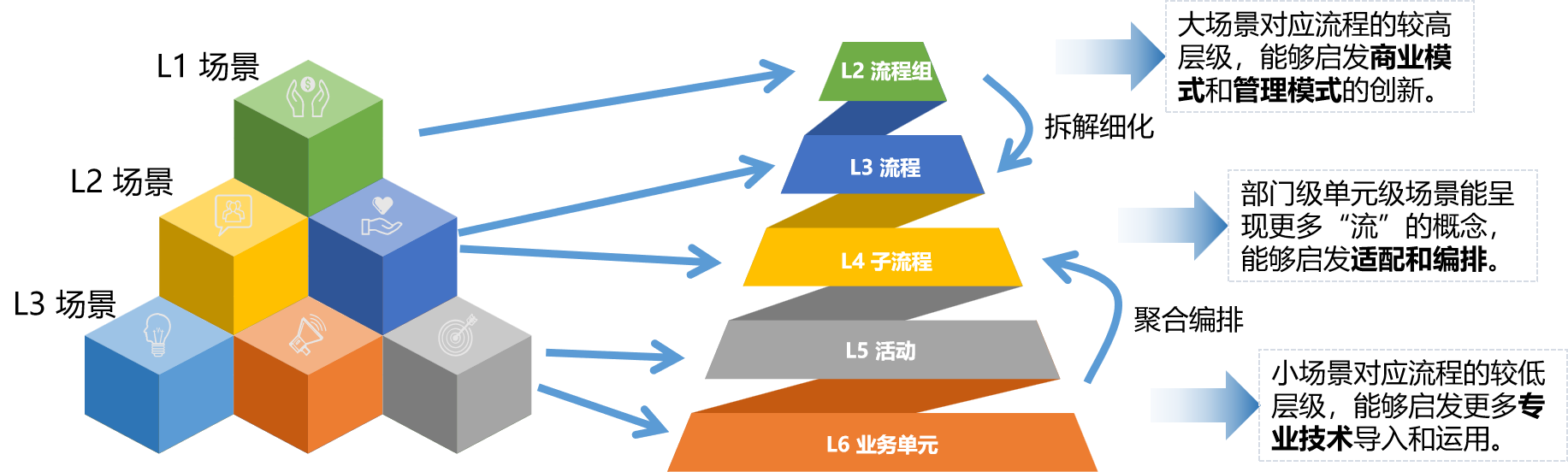 ​ 重点行动举例:寻找场景中的关键场景因子,通过关键场景因子组合找到具有价值的具体场景形态,对场景形态下的关键流程做规范的细化表达,以及所需的流程框架识别与分析等。