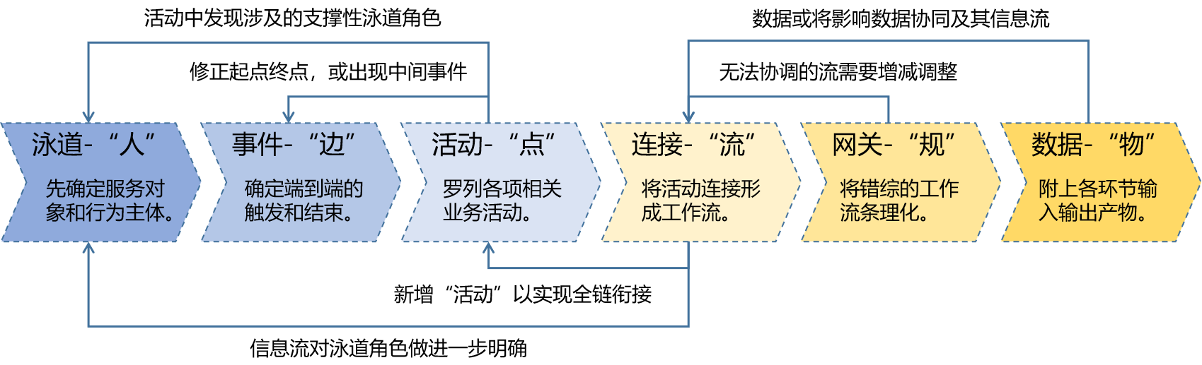 对于业务流程的定义与收敛,首先需要判断数字场景对应的流程层级,如图3.14所示,再有针对性的选择业务流程设计模式(正向设计、能力驱动设计等)与流程设计策略(包括依托角色设计、依托活动设计、业务单元编排等),明确活动、事件、网关、连接对象、泳道、数据等流程设计要素及要素间关联关系,如图3.15所示,并选用适当流程建模语言开展业务流程建模。
