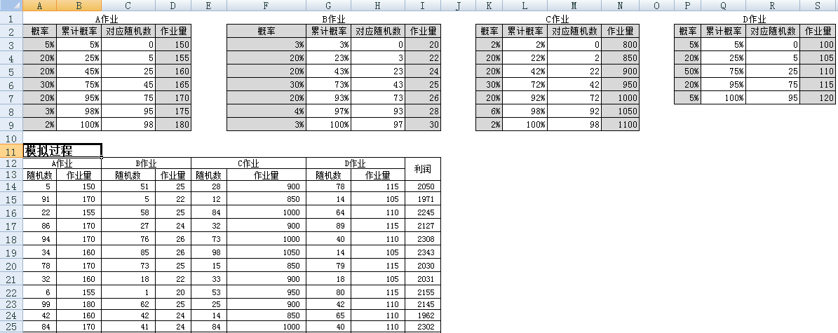 对于A、B、C、D四项作业的作业量的可能值及其概率,下面基于Excel电子表格介绍蒙特卡罗模拟的步骤和结果。
