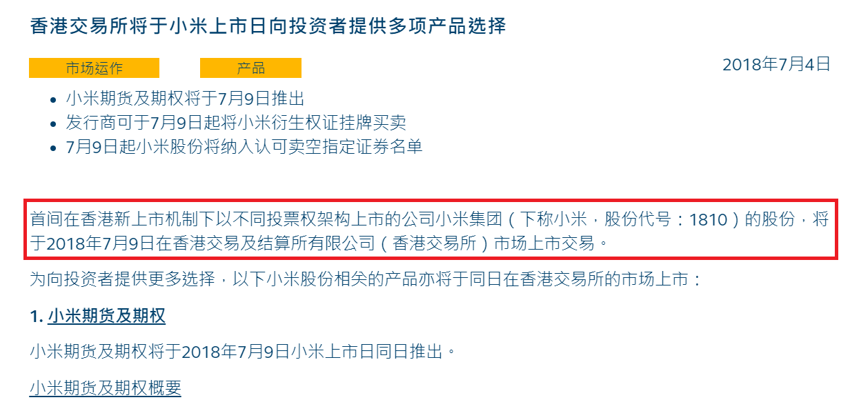 正是得益于同股不同权制度设计,小米招股说明书显示,雷军拥有小米公司31.4%的股份,却拥有公司53.79%的表决权。图3-16是香港交易所官网截图。