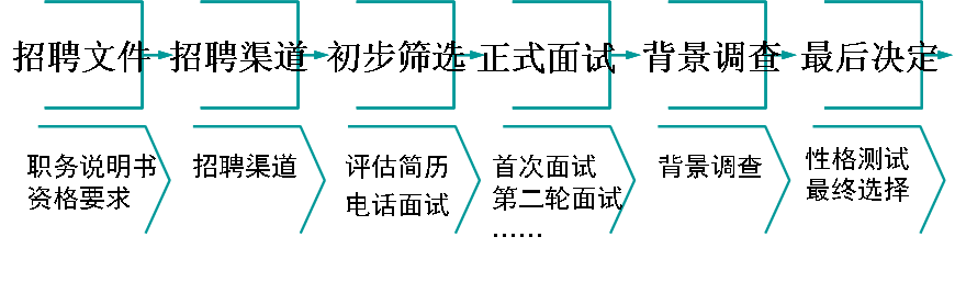 有人说当应聘者在进入面试的房间被面试官见到的一刹那,面试官基本上就完成50%的面试工作,如果接下来应聘者的谈话对面试官的胃口,十有八九会被录取,但候选人能否成功就要靠碰运气了。因此,招聘不能凭感觉和个人喜好,需要有系统和结构化面试的方法,只有这样才能把面试成功的不确定性降到最低。一个完整的招聘流程包括六个步骤:
