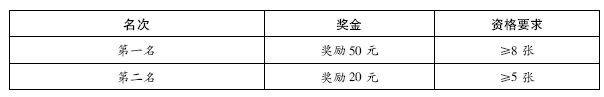 第一名:1名,奖励100元/人; 第二名: 2名,奖励50元/人; 第三名:3名,奖励20元/人。