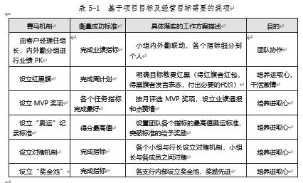 其次,行动学习是一场嘉年华的“奥斯卡”颁奖会。也就是说,每个月的月度复盘除了回顾目标、评估结果、分析原因、总结规律,还是一个“奥斯卡”的颁奖典礼会,为在上阶段取得辉煌业绩的团队授勋,让整个颁奖活动既有热烈庆祝的氛围,又有学习反思的空间。整个颁奖活动贯彻“三动”的设计原则:业绩颁奖让人激动、氛围互动让人感动、激励点评催人行动,以业务竞赛带动团队提升,实现我们组织的“冠军梦想”。我们会相应设计奖金擂主挑战赛、金牌擂主挑战赛、月度 MVP 奖、杰出员工奖、业绩破纪录奖等一系列基于项目目标及经营目标需要的奖项,如表 5-1所示。