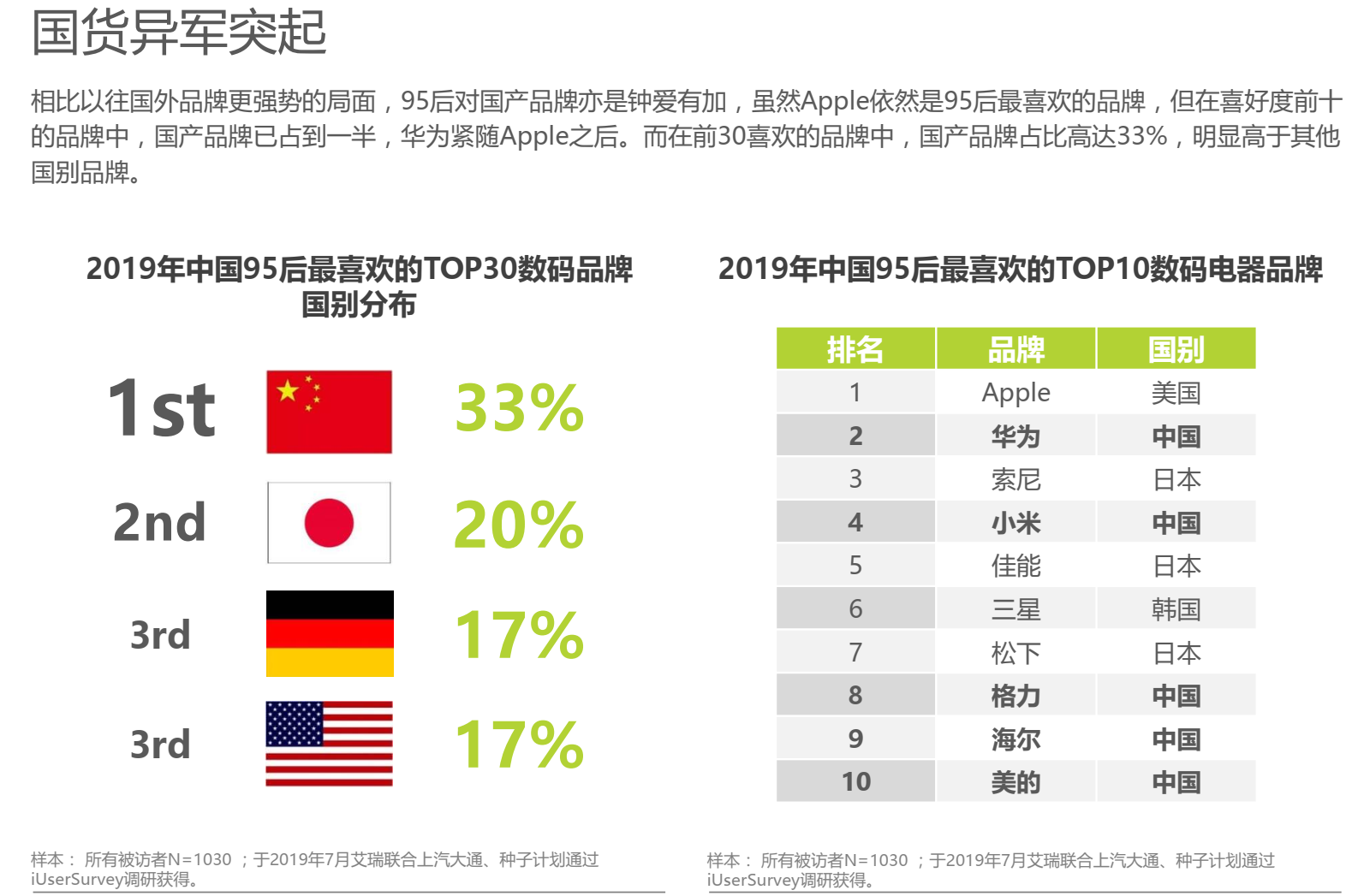 年轻人不但成为消费的中坚力量,而且也代表着消费需求变化的新的趋势。我们再来看一个数据,根据艾瑞咨询的《95后洞察报告》显示,现在的年轻人更爱国货!这就有些奇怪了,原来人们都是“喜欢进口货的”,就算是写的是“Made in China”,但是国外品牌更受欢迎。现在,国外品牌有档次、有面子的观念正在改变,现在的“95后”对国产品牌亦是钟爱有加,虽然Apple依然是“95后”最喜欢的品牌,但在喜好度前10的品牌中,国产品牌占一半,华为紧随Apple之后。而在前30喜欢的品牌中,国产品牌占比高达33%,明显高于其他国别品牌。如图2-5所示。