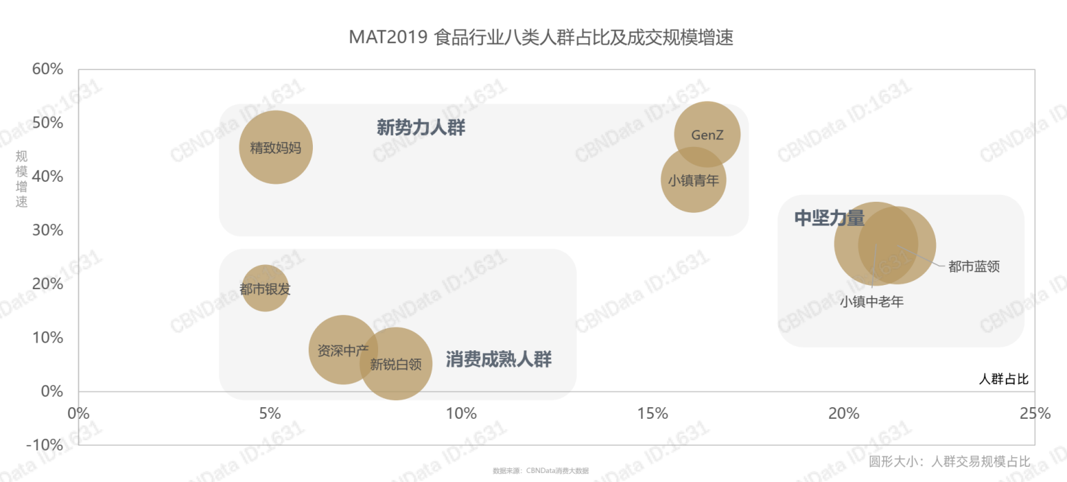 从食品类别的消费需求变化看,原来主要的消费群体叫“中产阶级”人群,就是收入高、学历高、消费高的“三高人群”,但是现在,不止是某一个人群是主流的消费群体,现在是多种消费人群崛起。“第一财经商业数据中心”和“天猫美食”的一份《2020天猫美食消费趋势报告》显示,现在食品行业消费人群中,有八大人群占比和成交规模在迅速扩大,其中就包括“小镇中老年”和“都市蓝领”。如图2-6所示。