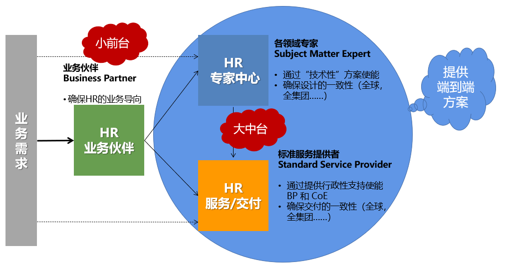 我把背后的逻辑叫作小前台和大中台的HR组织架构,即BP作为前台,CoE和SSC合体作为中台,给客户提供端到端的解决方案。图2-3的HR组织结构比较完整全面地描述了这样的组织,可以作为业务型HR架构参考。