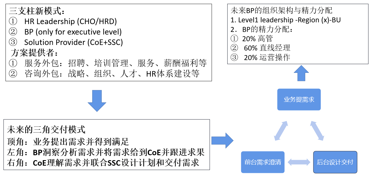 (3)在三支柱中,我大胆预测,专家中心和SSC将逐步被社会化和外包,开始可能是内部共享承包,并逐步走向社会化。这样企业的HR将保留最少的人头,发挥最大的效能。当然,对内部HR要求会更高。我相信十年后这样的HR组织会越来越多。