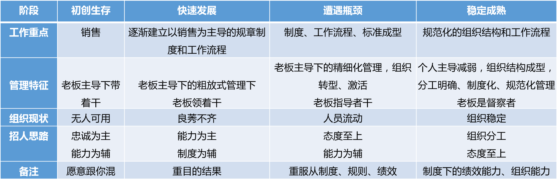 初创期靠老板自己带着干。老板的话就是规则,否则生意做好很难;自己不愿意干,需有一个代替自己的经理人。